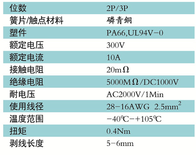 接線端子的絕緣材料用改性的尼龍(PA66),能達到或超過IEC947-7-1及EN60947-7-1標準,阻燃等級達到UL94,V-0具有良好的電氣性能和機械性能。螺絲用高強度的鋼制成鍍鋅或鎳處理,導電體四方針用合金銅制成表面鍍錫,壓片采用彈性及極強的磷青銅表面鍍錫或鎳;壓線框用抗應力裂縫腐蝕的合金銅制成,這些金屬表面還鍍錫或鍍鎳加以保護。設計完全符合IEC60947-7-1.GB14048.7等標準。